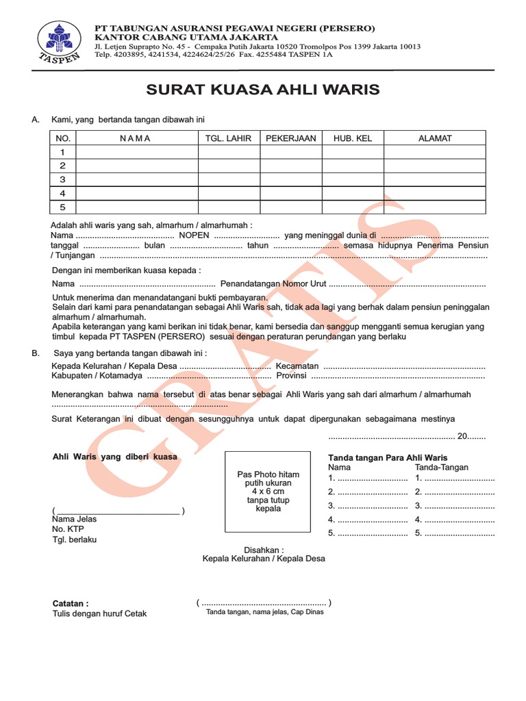 Sebagai informasi, surat keterangan waris ini bisa digunakan untuk keperluan lain seperti mengklaim asuransi, mengambil barang yang tersimpan di kantor dan sebagainya. Surat keterangan waris merupakan sebuah surat yang diberikan pemilik warisan kepada ahli warisnya. Surat ini punya kekuatan hukum sebab harus melalui proses persetujuan pejabat pemerintah setempat, misalnya dari kelurahan dan kecamatan atau jasa pejabat pembuat akta tanah. T bertempat tinggal terakhir di kemantan kelurahan sungai bengkal dan pada tahun 2001 telah meninggal dunia karena sakit. Surat keterangan ahli waris yang ditandangani oleh para ahli waris dengan diberi materai min 6000 dan diketahui serta ditandatangani oleh para saksi yaitu ketua rw dan rt setempat.